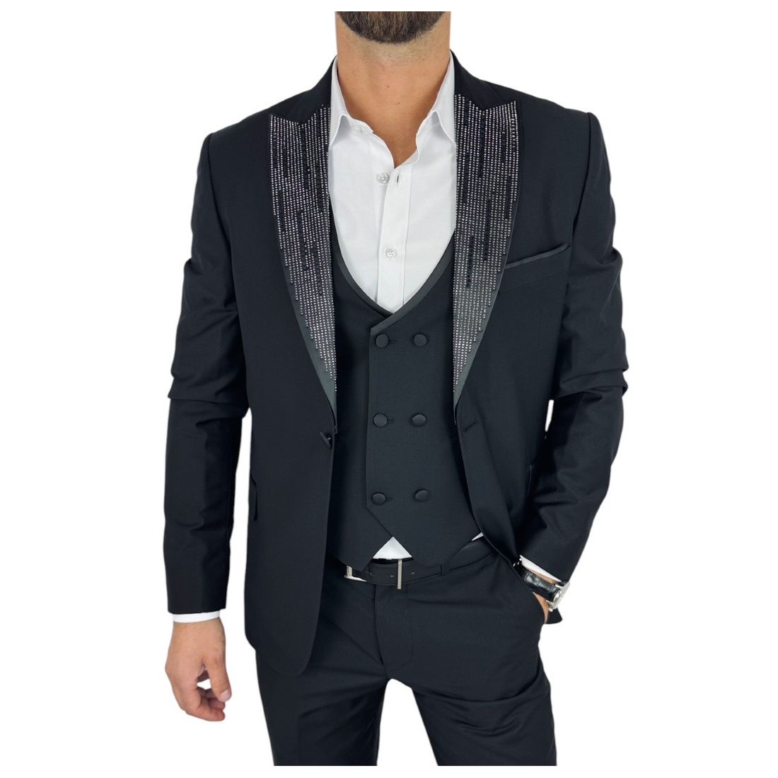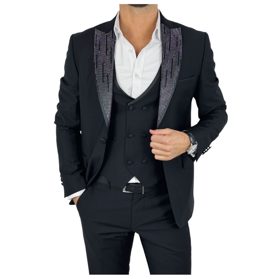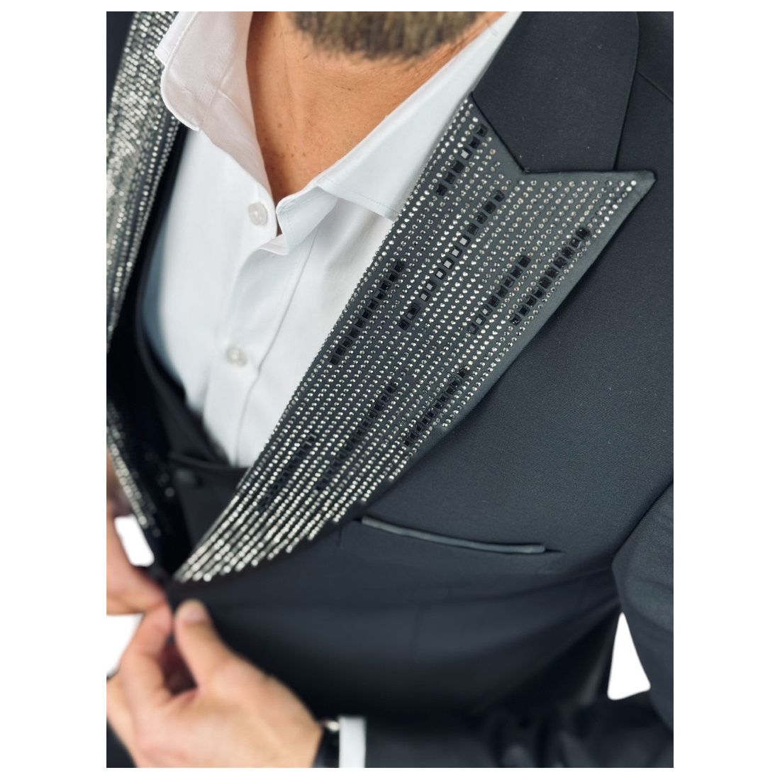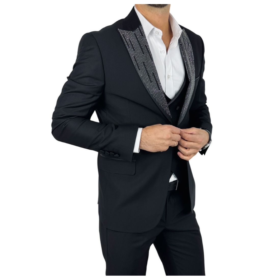 Szukasz wyjątkowego garnituru na specjalne okazje? Ten włoski projekt to połączenie klasy, nowoczesności i luksusu. Trzyczęściowy zestaw GIOVANNI PERA zachwyca perfekcyjnym krojem Slim-Fit oraz niezwykle efektownym wykończeniem – kołnierz ozdobiony mieniącymi się kryształami dodaje stylizacji niepowtarzalnego charakteru.