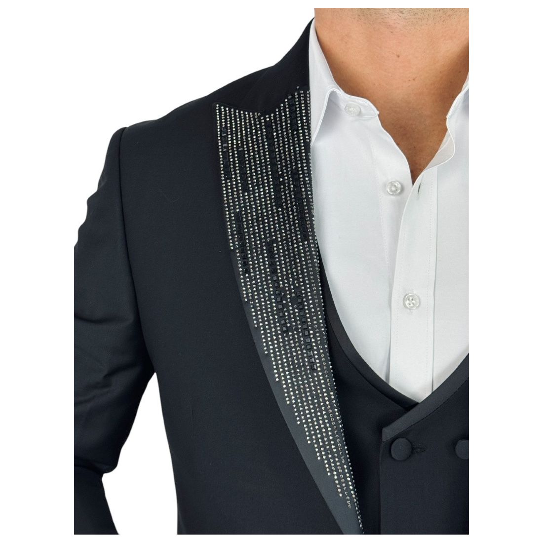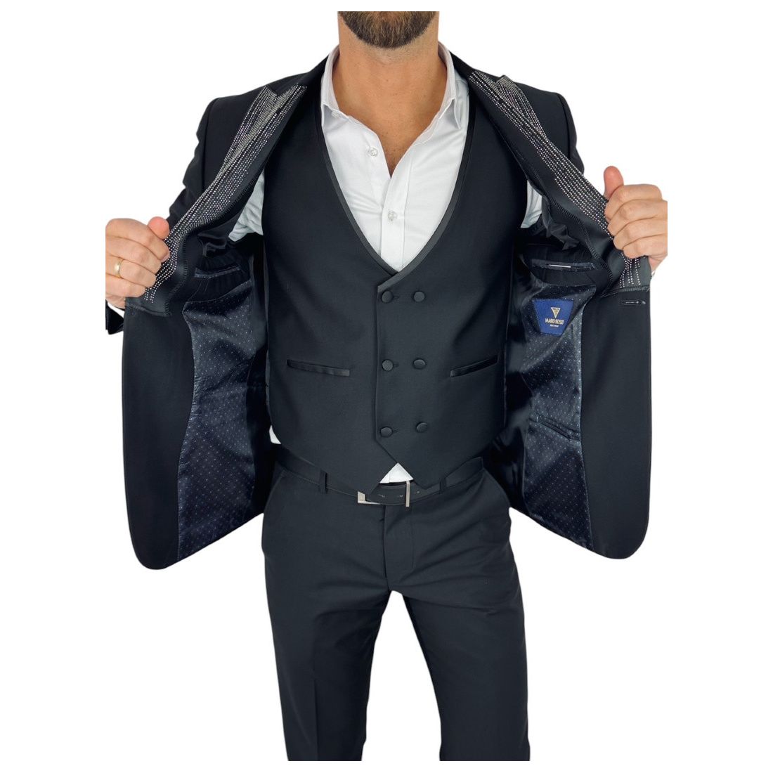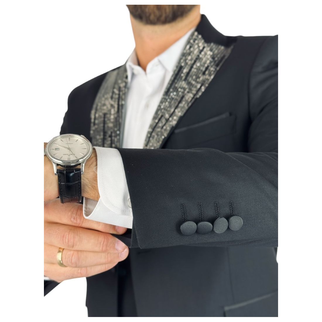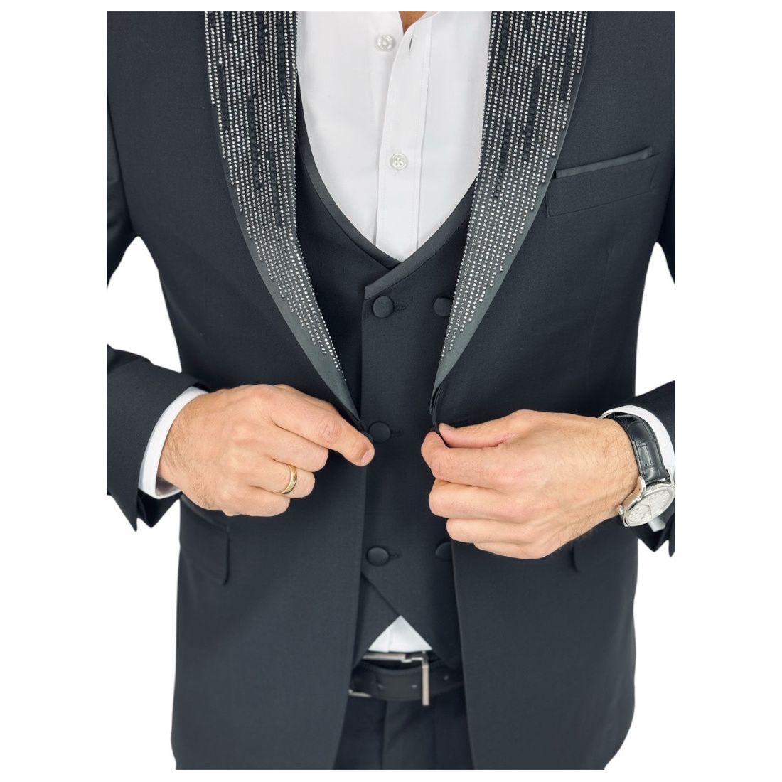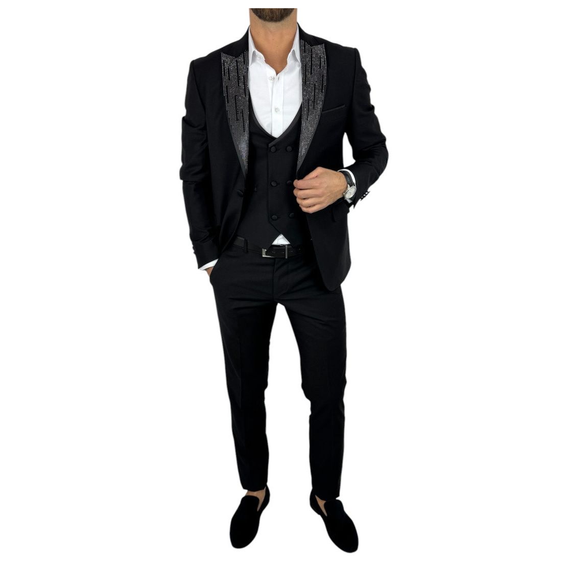 Szukasz wyjątkowego garnituru na specjalne okazje? Ten włoski projekt to połączenie klasy, nowoczesności i luksusu. Trzyczęściowy zestaw GIOVANNI PERA zachwyca perfekcyjnym krojem Slim-Fit oraz niezwykle efektownym wykończeniem – kołnierz ozdobiony mieniącymi się kryształami dodaje stylizacji niepowtarzalnego charakteru.
