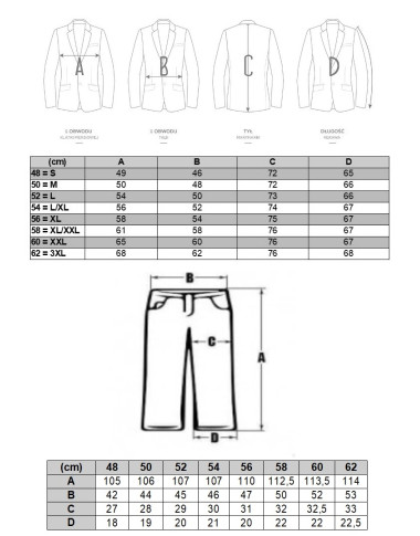 - Przy wyborze rozmiaru proponujemy zmierzyć swoje dotychczas noszone ubrania, te które leżą na Tobie najlepiej (marynarka lub kurtka, spodnie) - porównaj z tabelą.