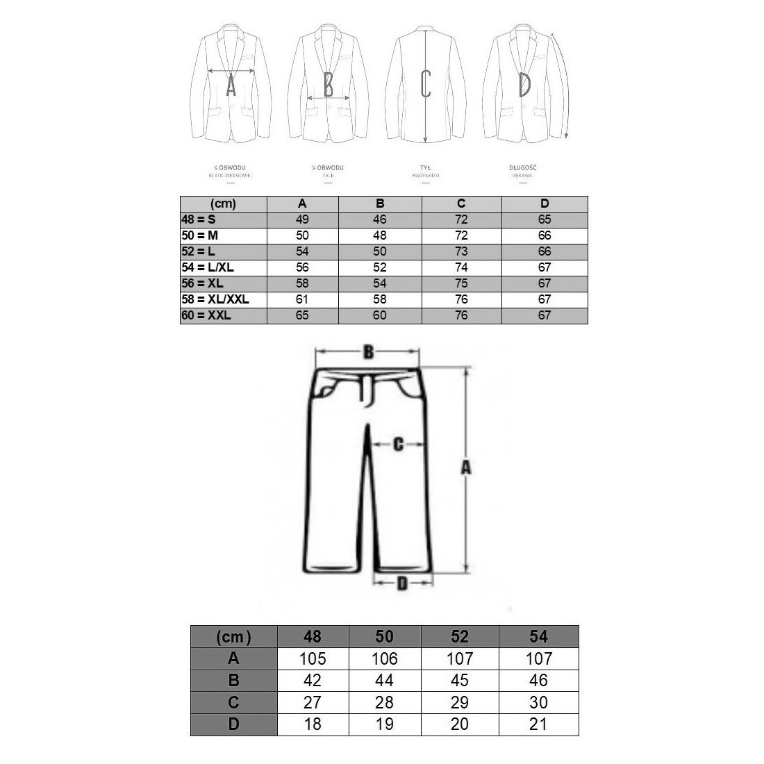 👉 Wskazówka dotycząca rozmiaru: przed zakupem zmierz swoje najlepiej dopasowane ubrania (marynarkę/kurtkę oraz spodnie) i porównaj wymiary z tabelą, aby wybrać idealny rozmiar.