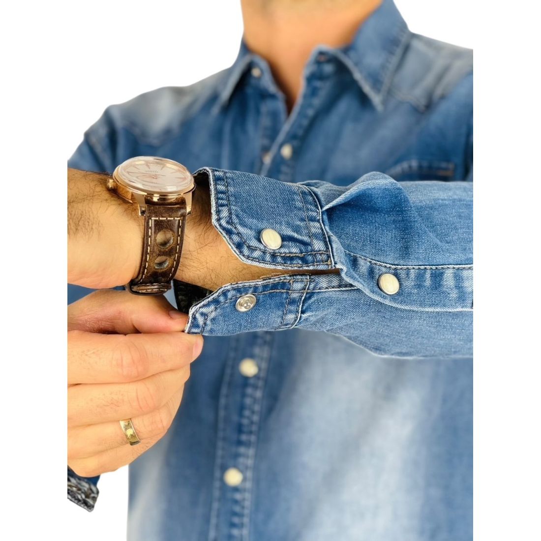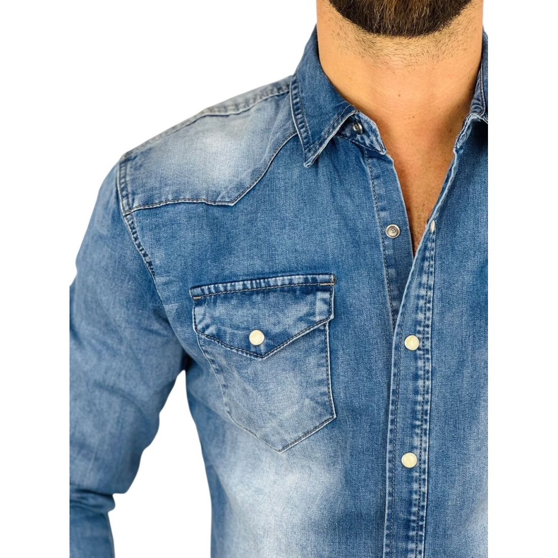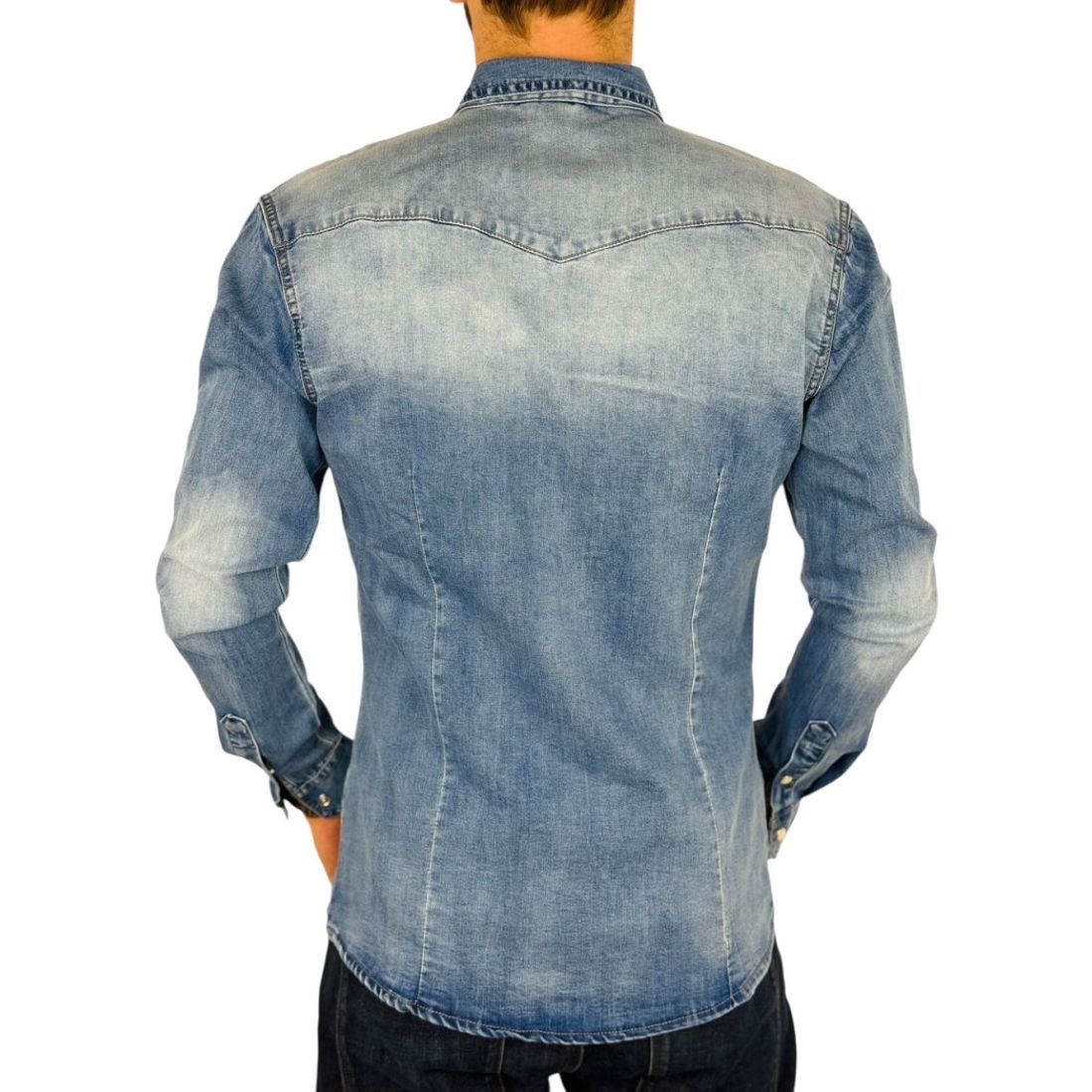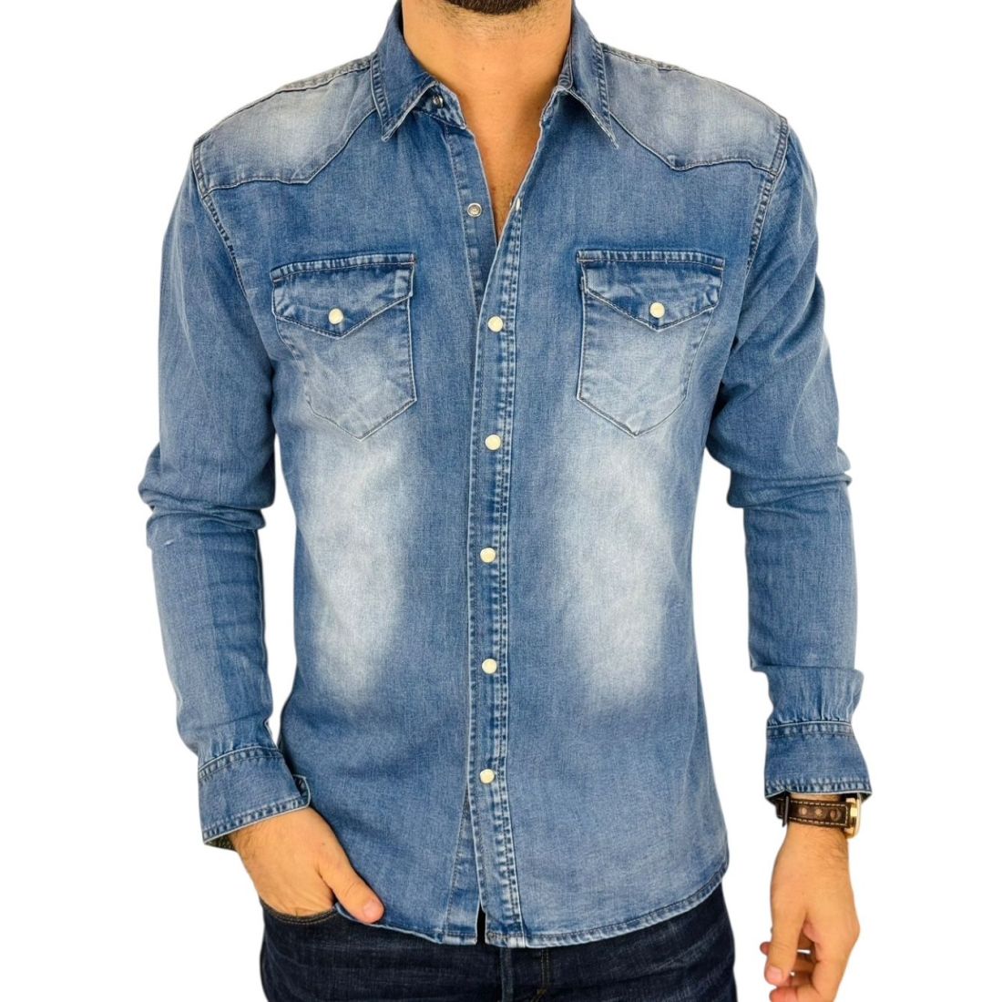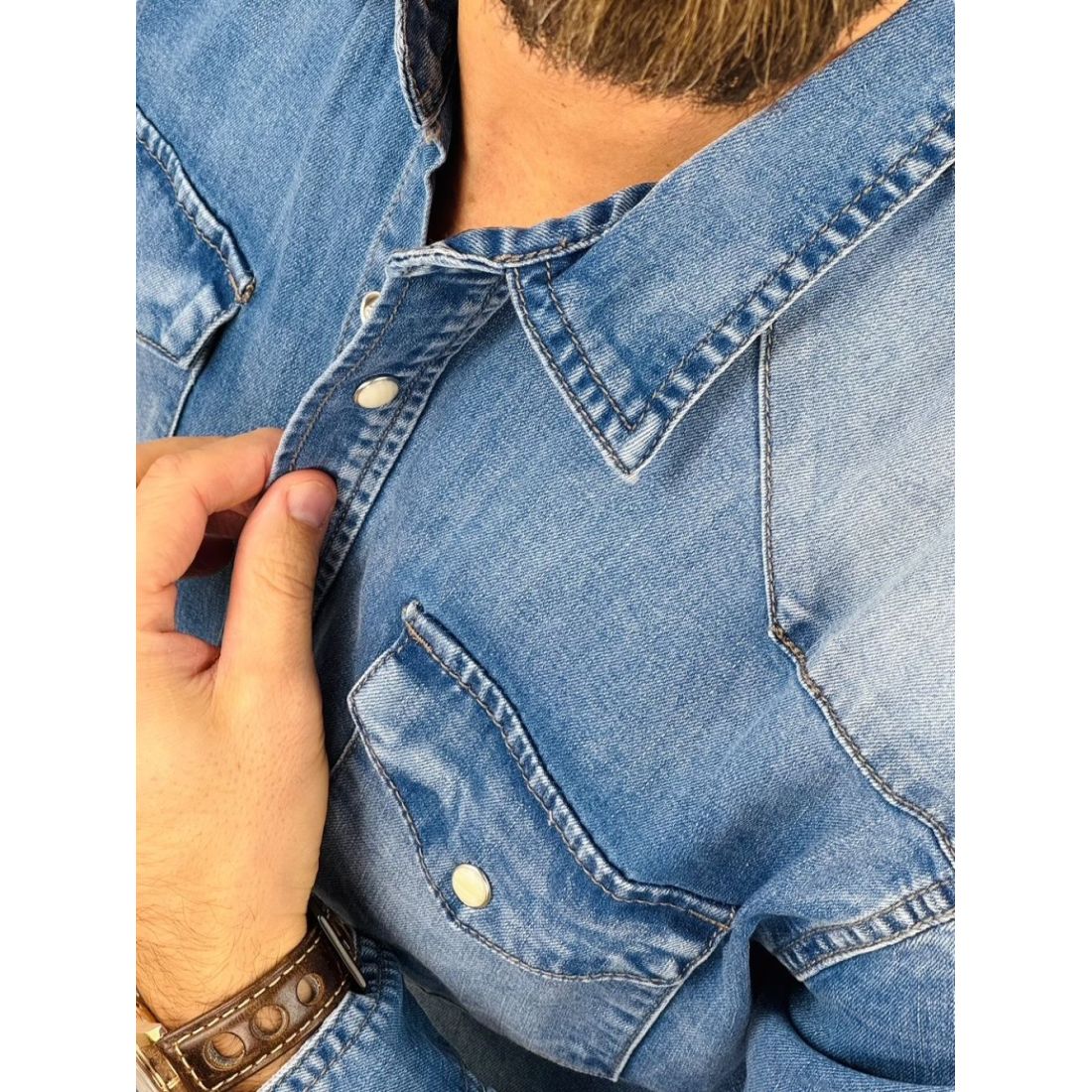 BRUNO LEONI Koszula męska niebieska KB1 jeansowa - na napy, Super Slim