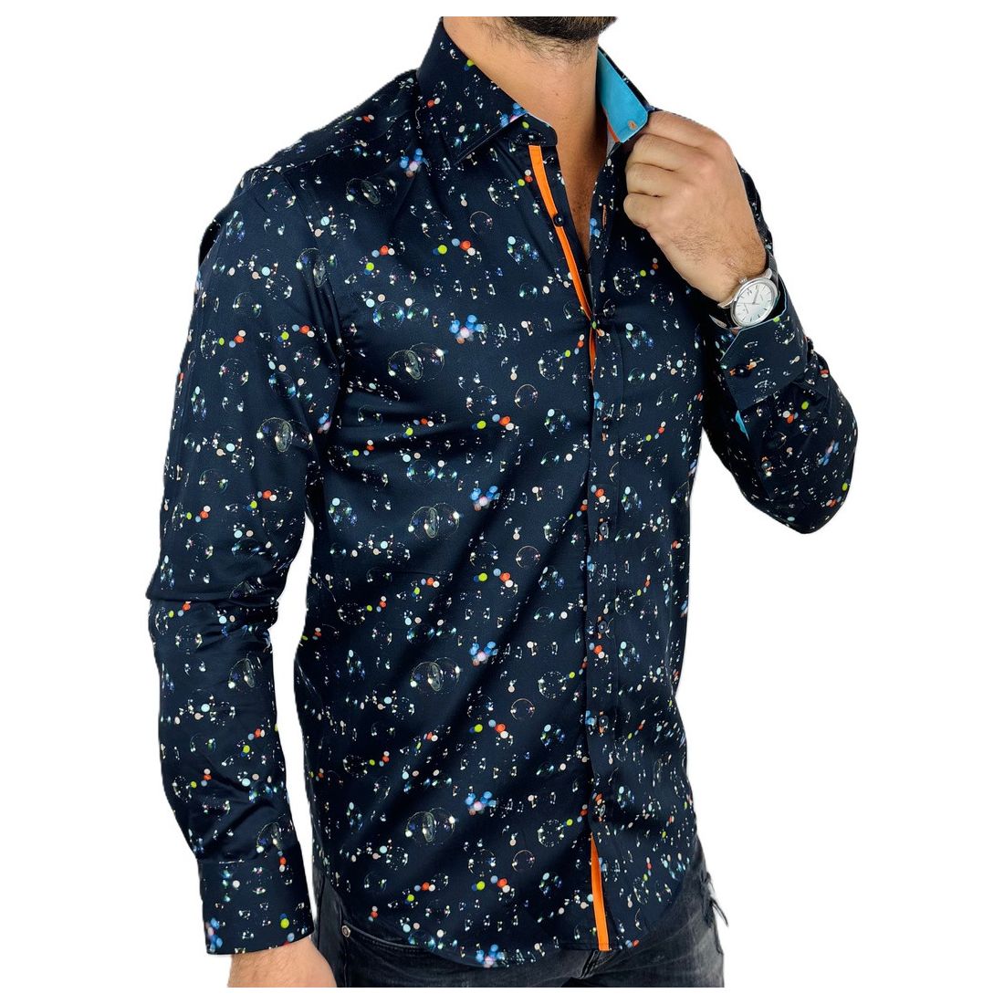 DANIEL BESSI Koszula męska fb111 granatowa w kolorowe bańki mydlane