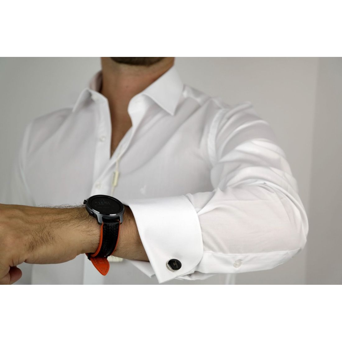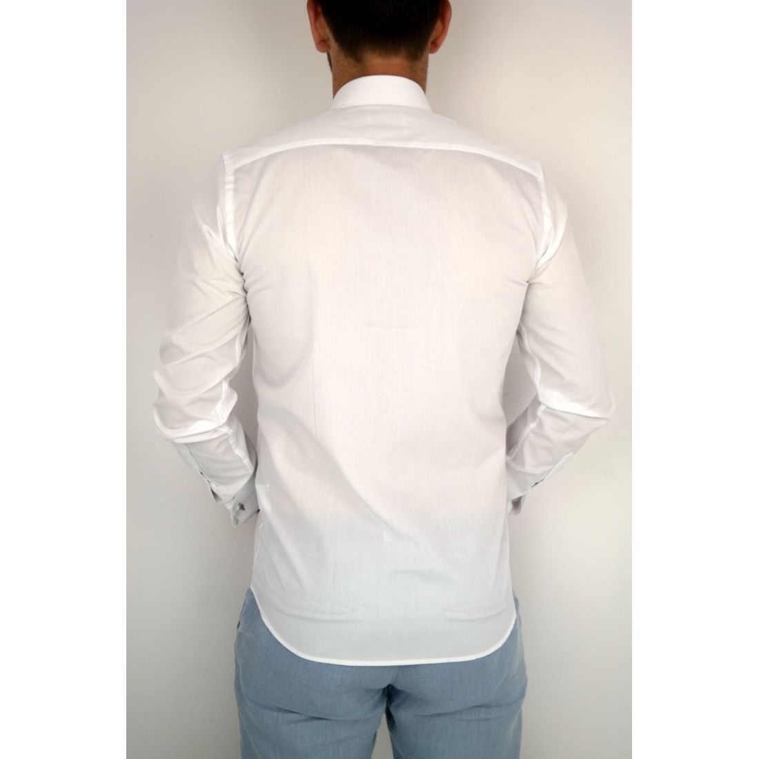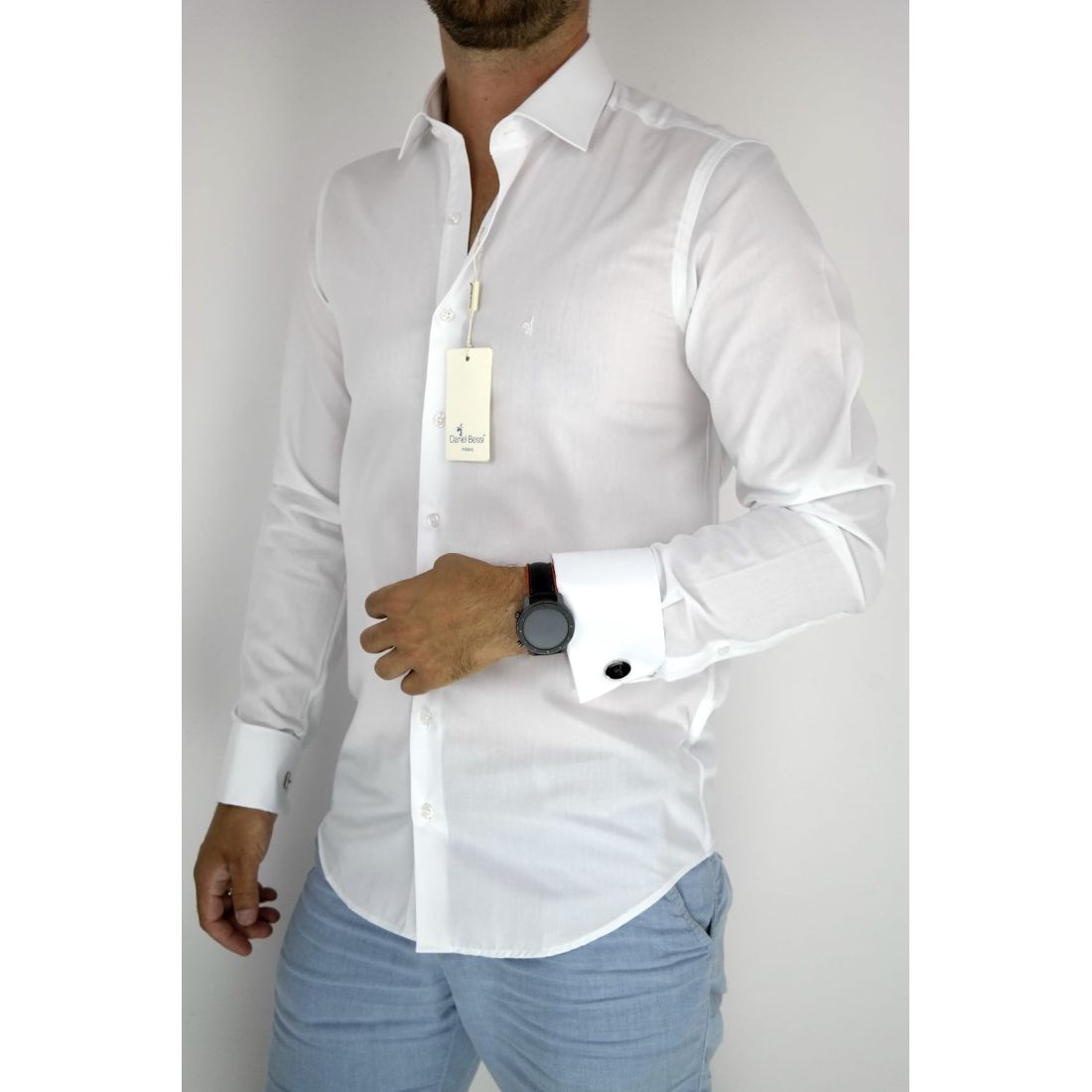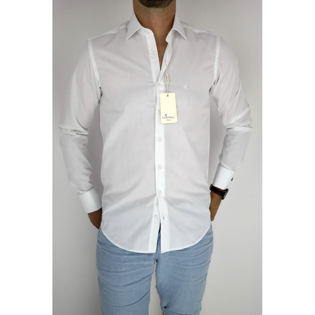 DANIEL BESSI Koszula męska na spinki biała elegancka fb002 na stójce, czarne guziki
