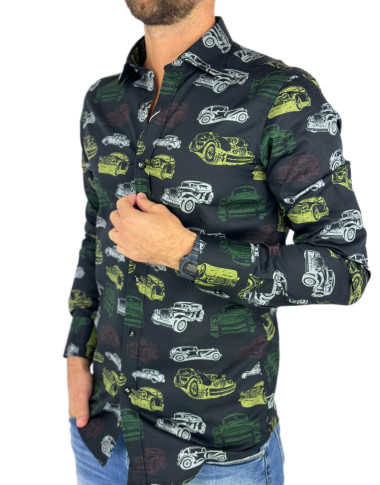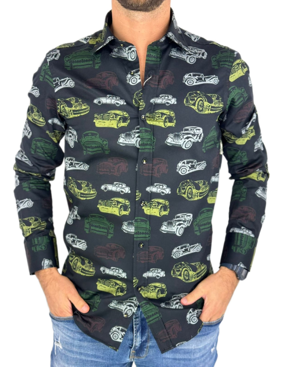 GIOVANNI PERA Koszula męska GP350 czarna, auta, kolorowe, samochody