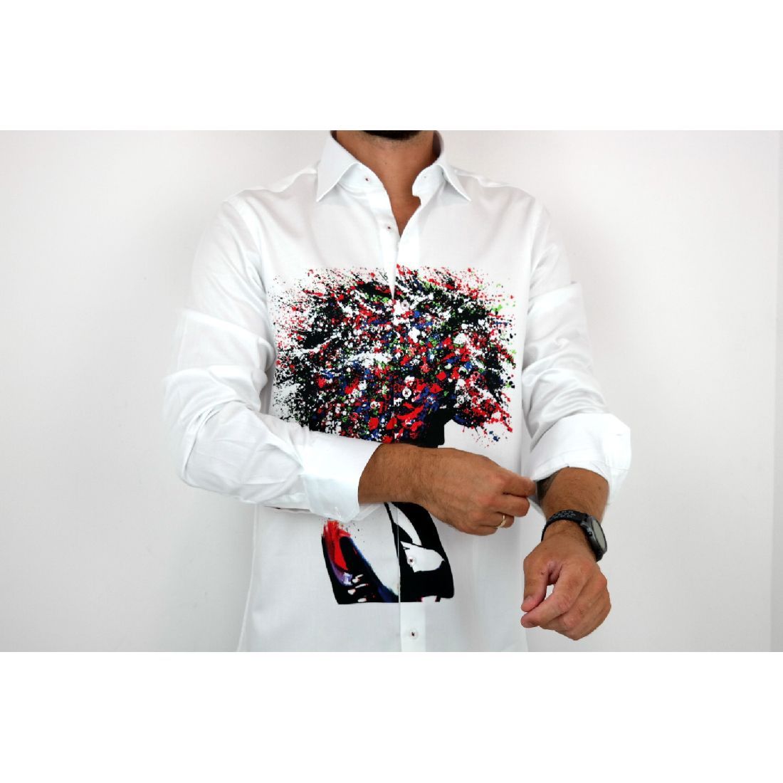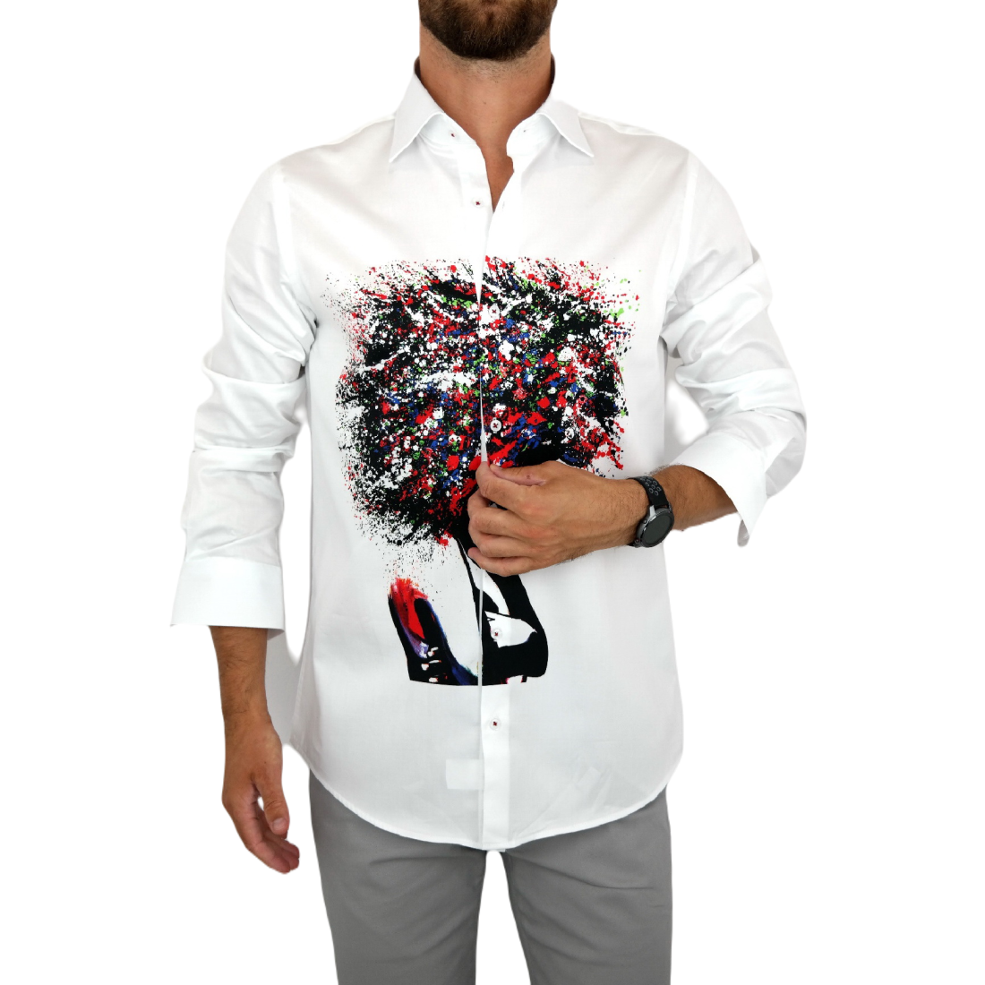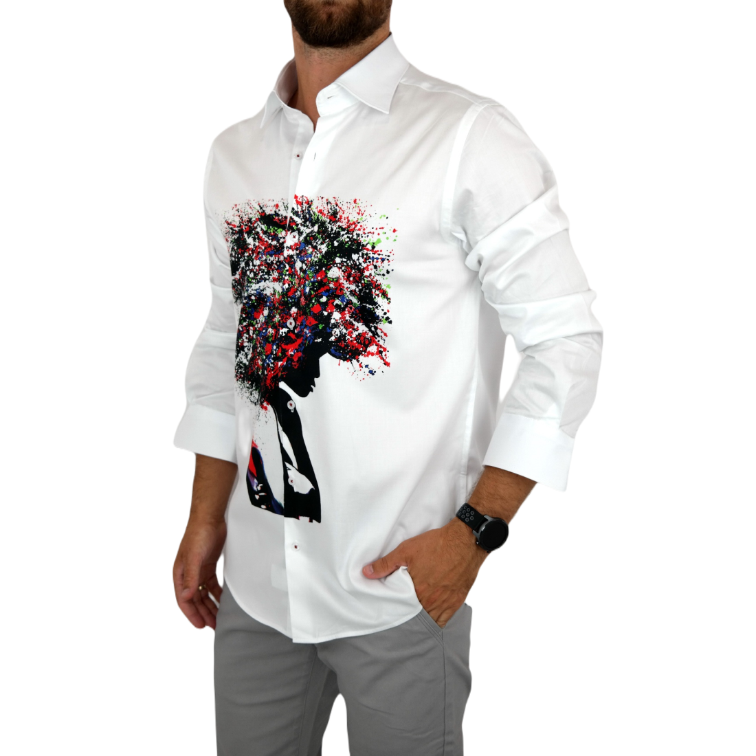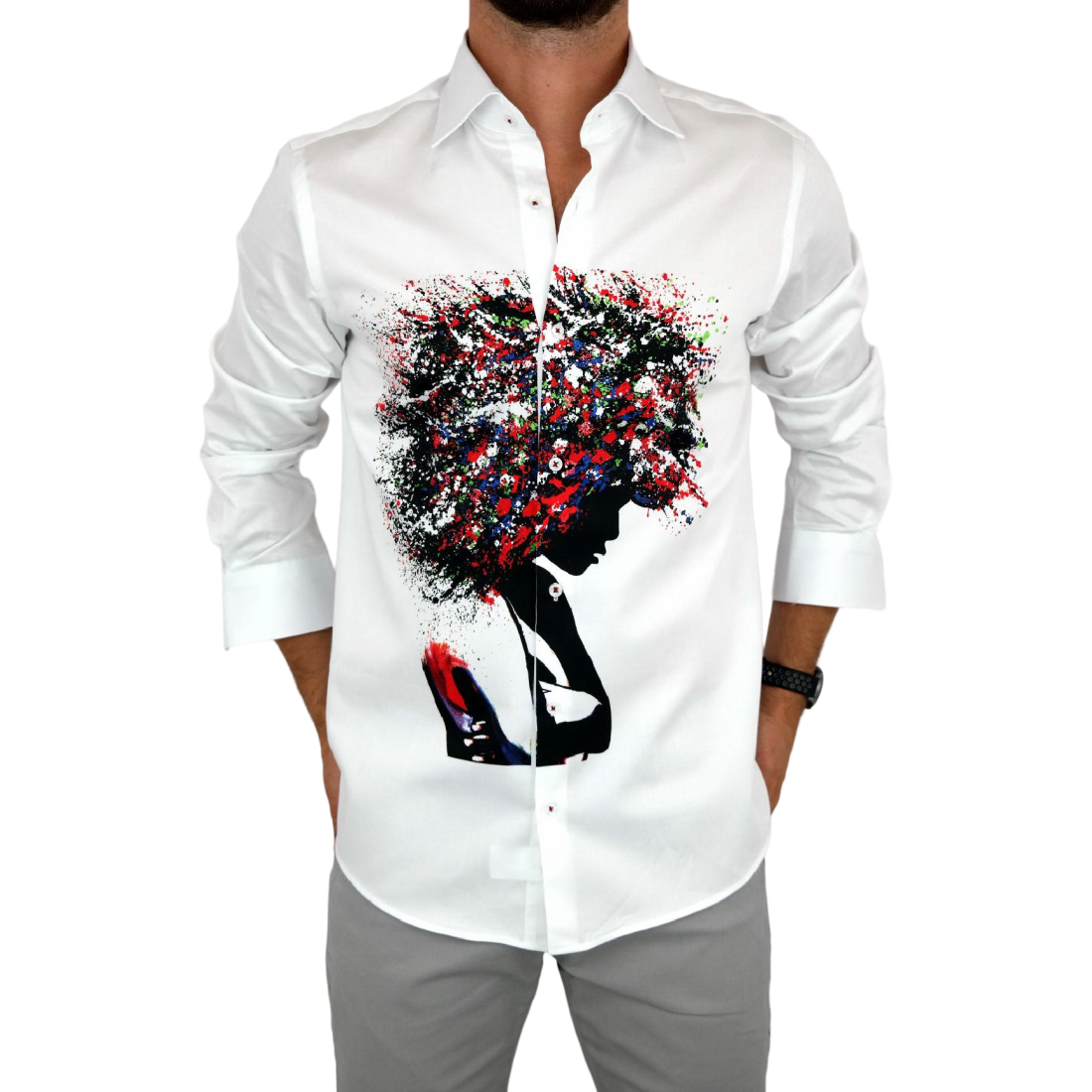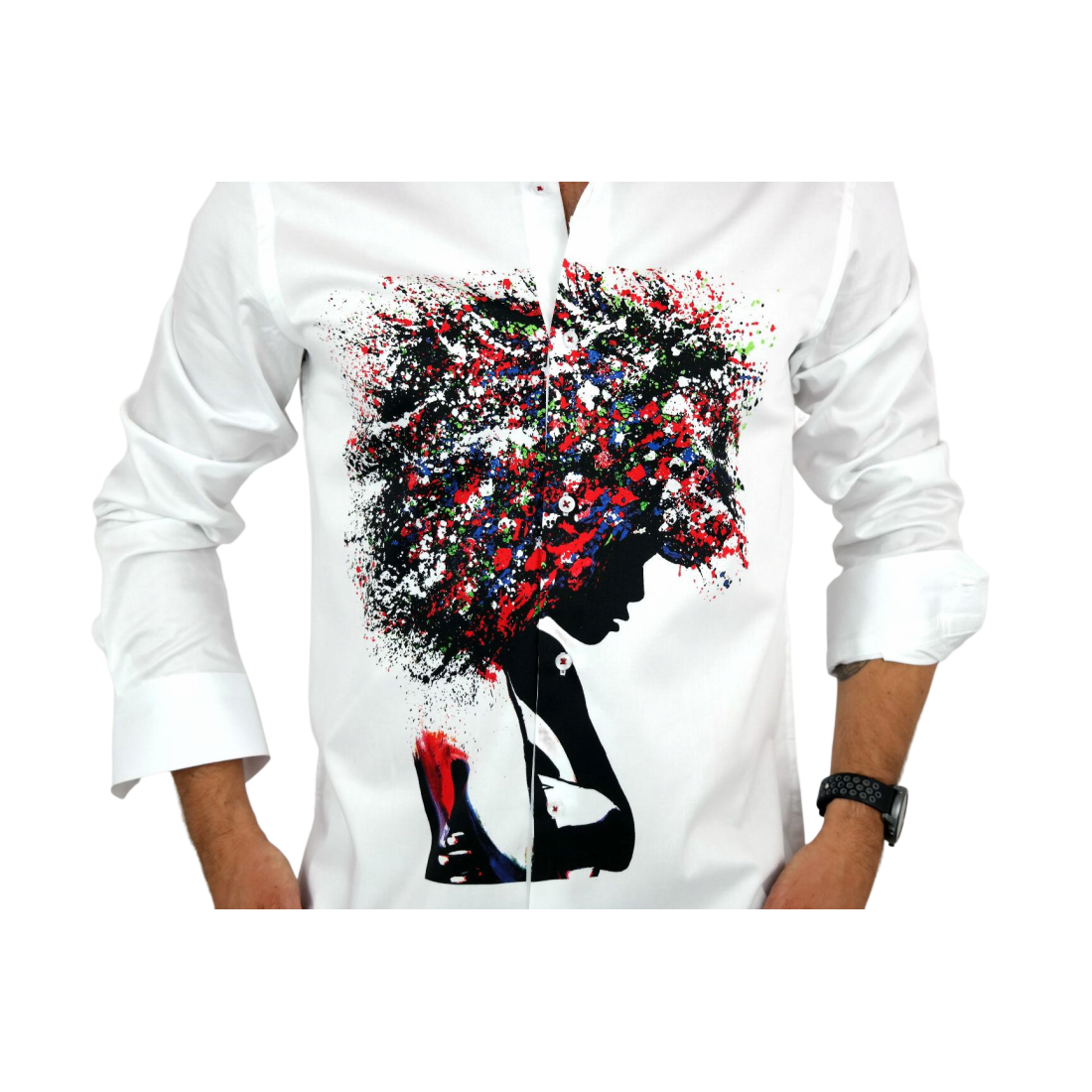 GUISEPPE LUIGI Koszula męska GL28 biała z efektownym kolorowym nadrukiem, kobieta/drzewo