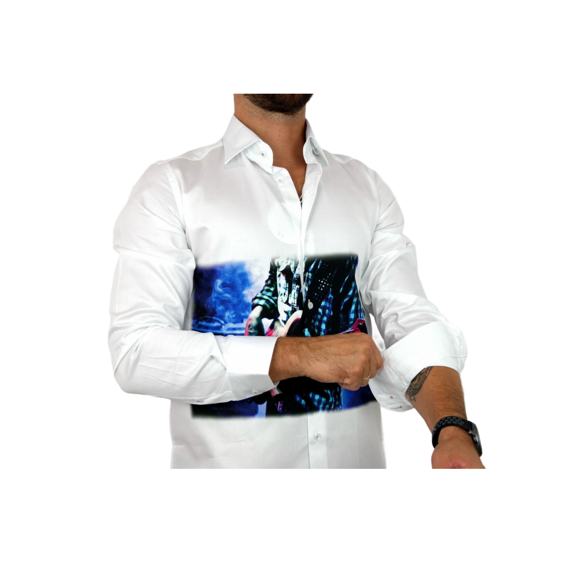 GUISEPPE LUIGI Koszula męska GL34 biała z efektownym kolorowym nadrukiem muzycznym, gitarzysta
