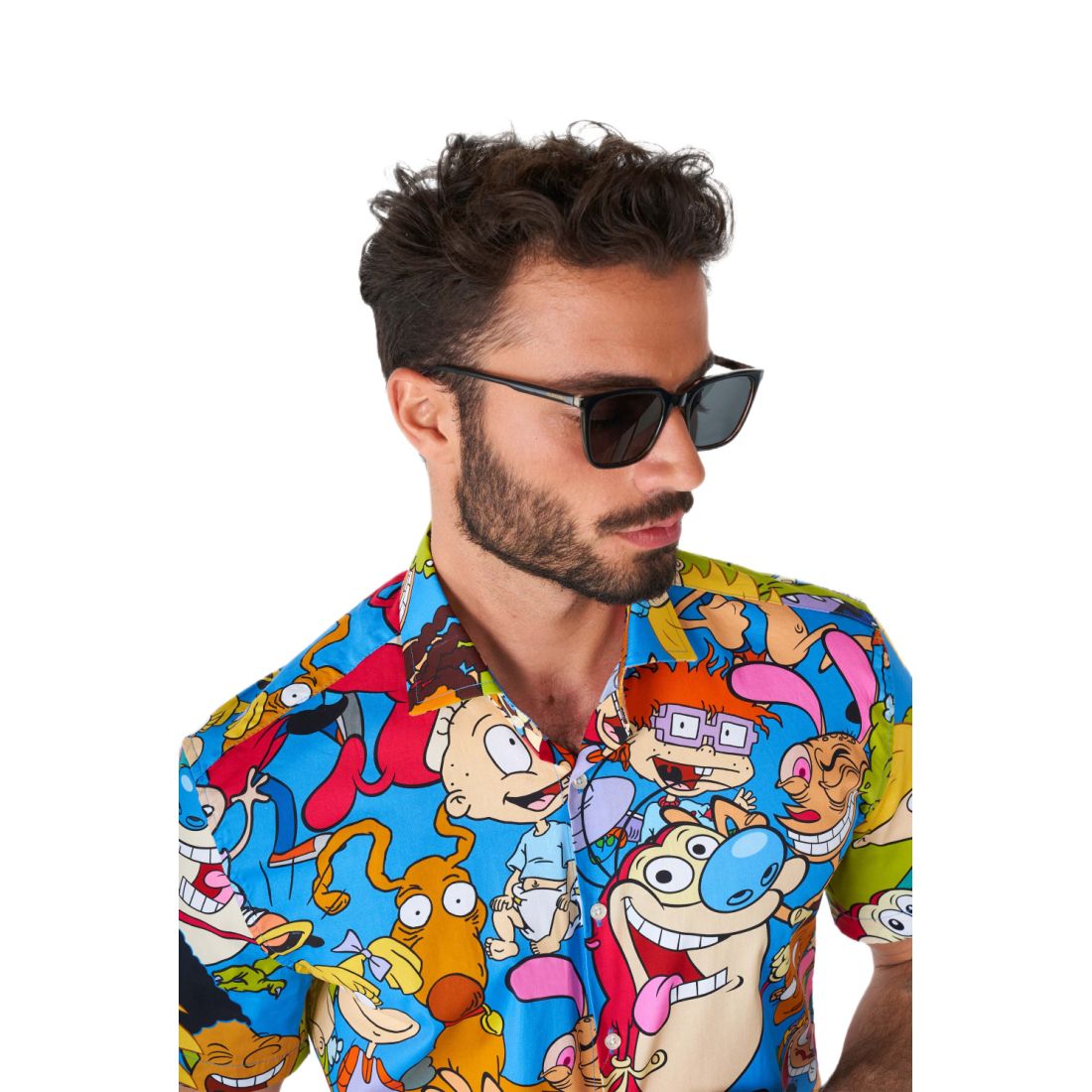 Wyróżnij się i wróć do kultowych lat 90.! Męska koszula z krótkim rękawem OPPOSUITS zachwyca kolorowym wzorem z legendarnymi kreskówkami Nickelodeon w jednym, efektownym nadruku.