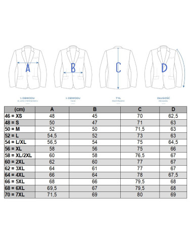 - Przy wyborze rozmiaru proponujemy zmierzyć swoje dotychczas noszone ubrania, te które leżą na Tobie najlepiej (marynarka lub kurtka) - porównaj z tabelą.