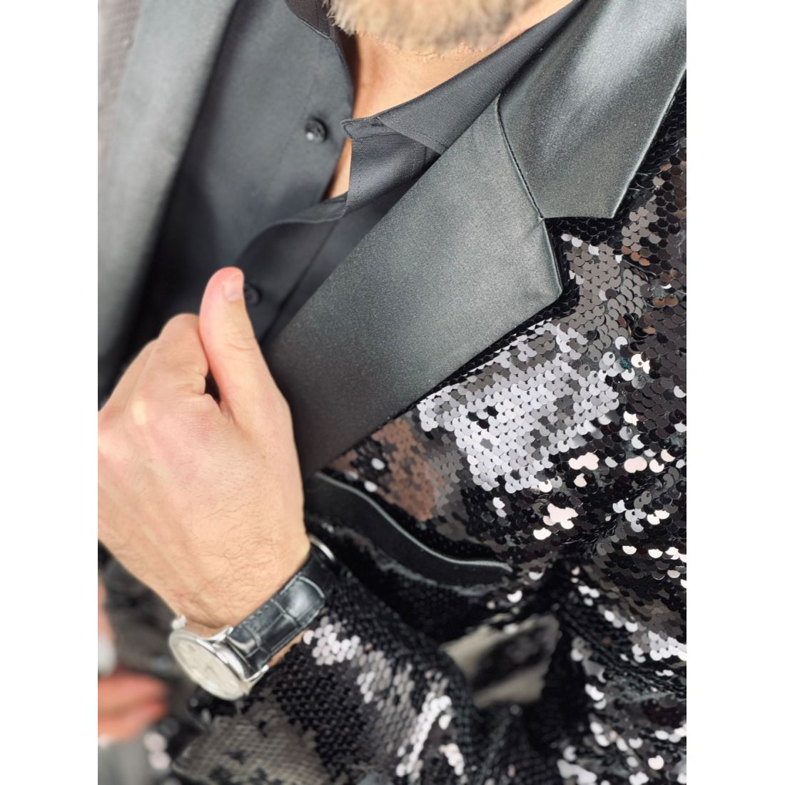 Efektownie połyskująca powierzchnia pięknie odbija światło, dzięki czemu marynarka doskonale sprawdzi się na imprezach, weselach, eventach czy występach scenicznych. To idealny wybór dla gościa specjalnego, prowadzącego lub gwiazdy estrady.