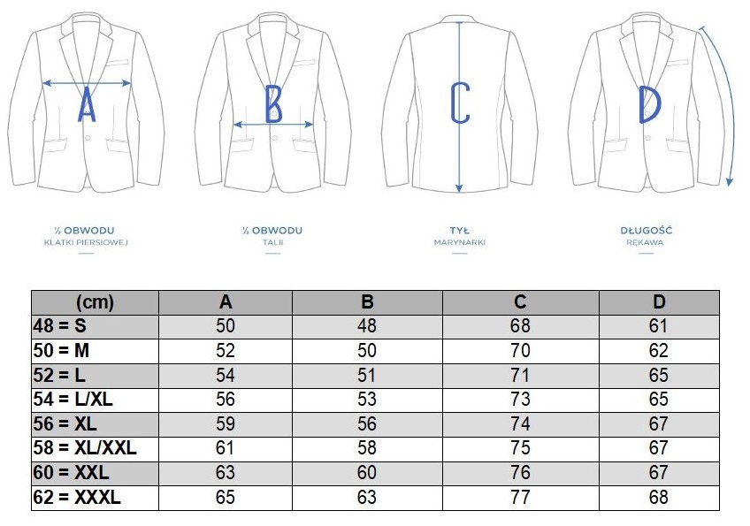 Przy wyborze rozmiaru zalecamy zmierzyć swoją najlepiej dopasowaną marynarkę lub kurtkę i porównać wymiary z tabelą rozmiarów.