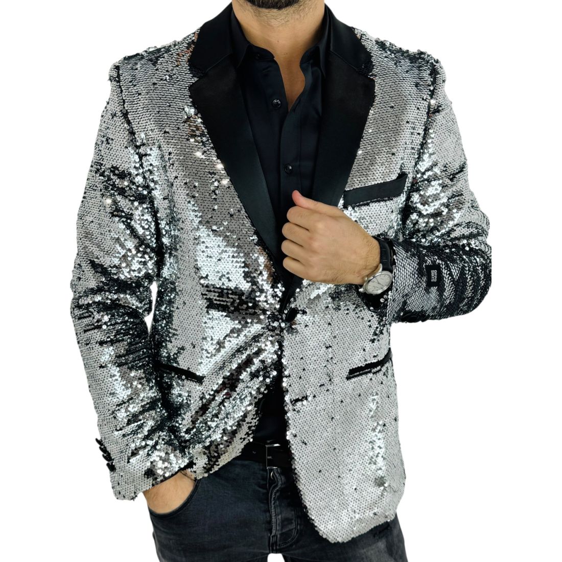 Efektownie połyskująca powierzchnia pięknie odbija światło, dzięki czemu marynarka doskonale sprawdzi się na imprezach, weselach, eventach czy występach scenicznych. To idealny wybór dla gościa specjalnego, prowadzącego lub gwiazdy estrady.