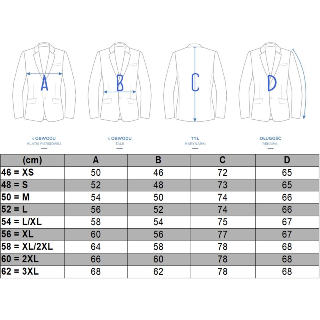 Przy wyborze rozmiaru zalecamy zmierzyć swoją najlepiej dopasowaną marynarkę lub kurtkę i porównać wymiary z tabelą rozmiarów.